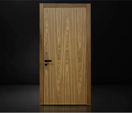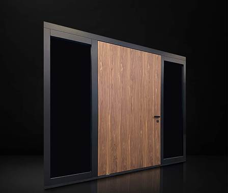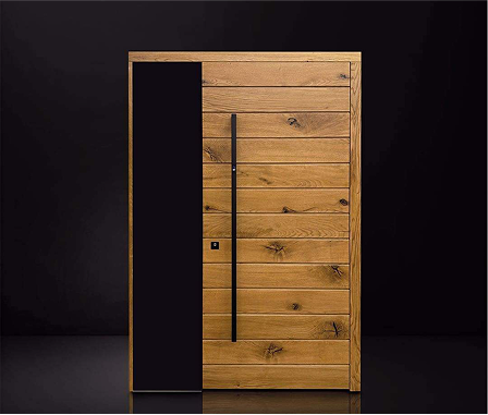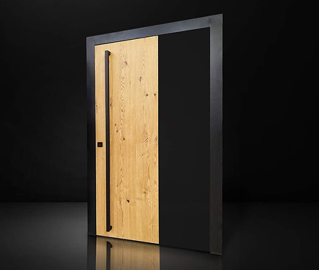 Solidne dębowe skrzydło z aluminiową nakładką na ościeżnicy oraz zawias PIVOT z funkcją samozamykania zapewniają trwałość i płynność użytkowania.