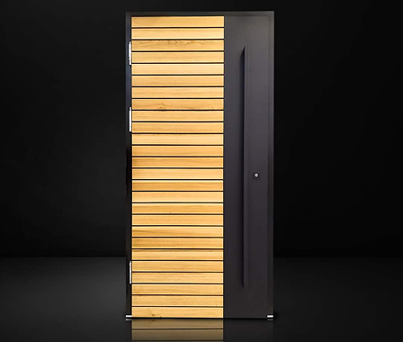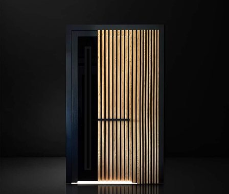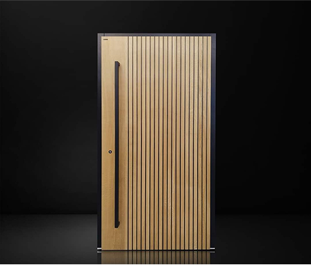 Drzwi Lamello L-1 to kwintesencja luksusu z nowoczesnym designem lamelowego panelu i unikalnymi dębowymi wykończeniami. Każdy detal, w tym wystające lamele i solidny system mocowania, został precyzyjnie dopracowany, aby podkreślić wyjątkowy charakter konstrukcji.