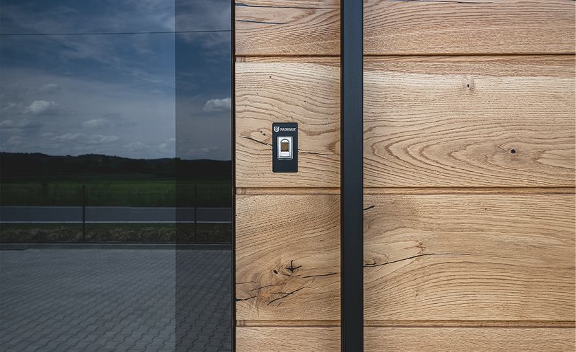 Dyskretny czarny uchwyt z wbudowanym czytnikiem linii papilarnych pozwala na łatwe otwieranie drzwi także za pomocą aplikacji na smartfonie.