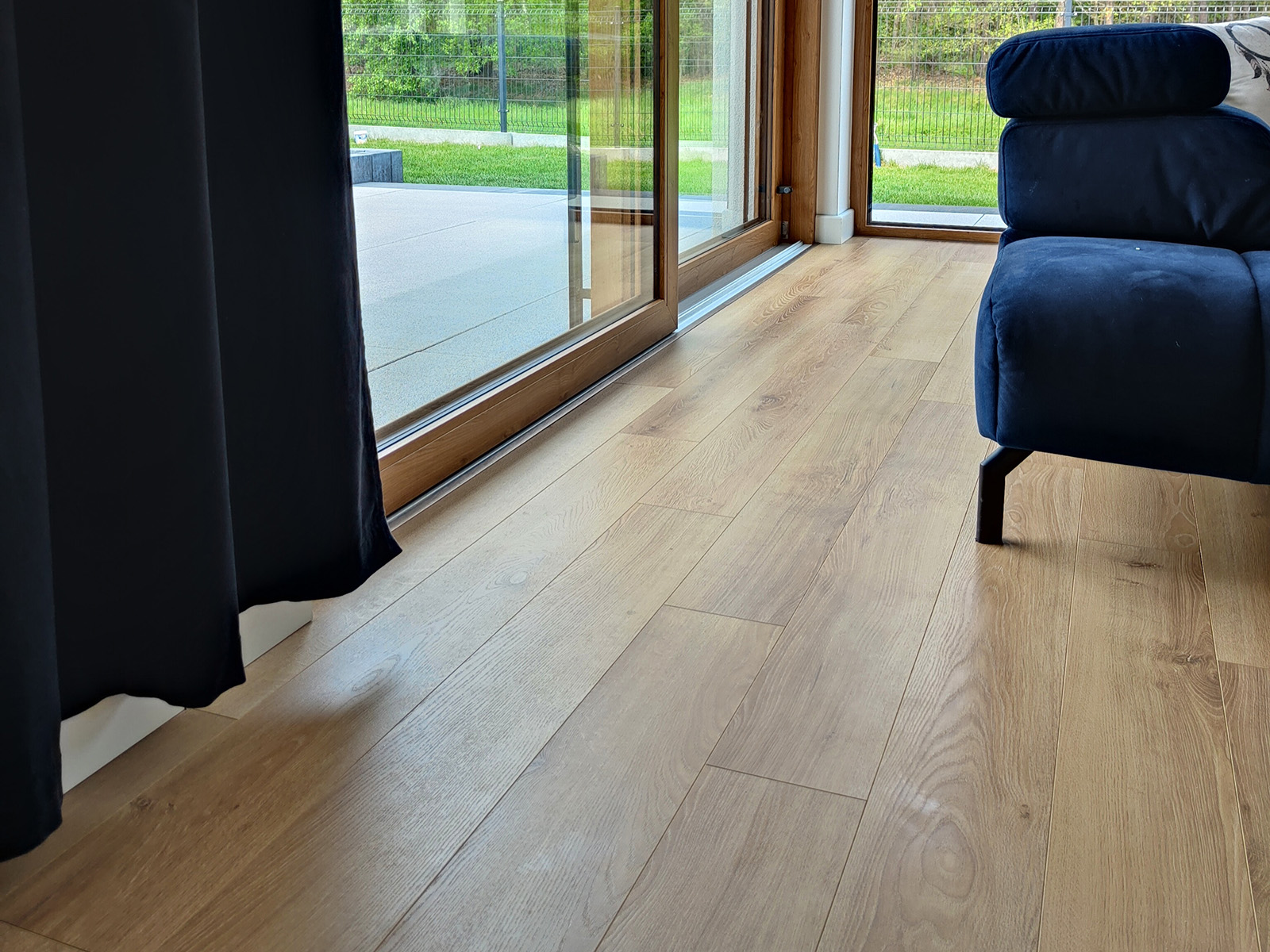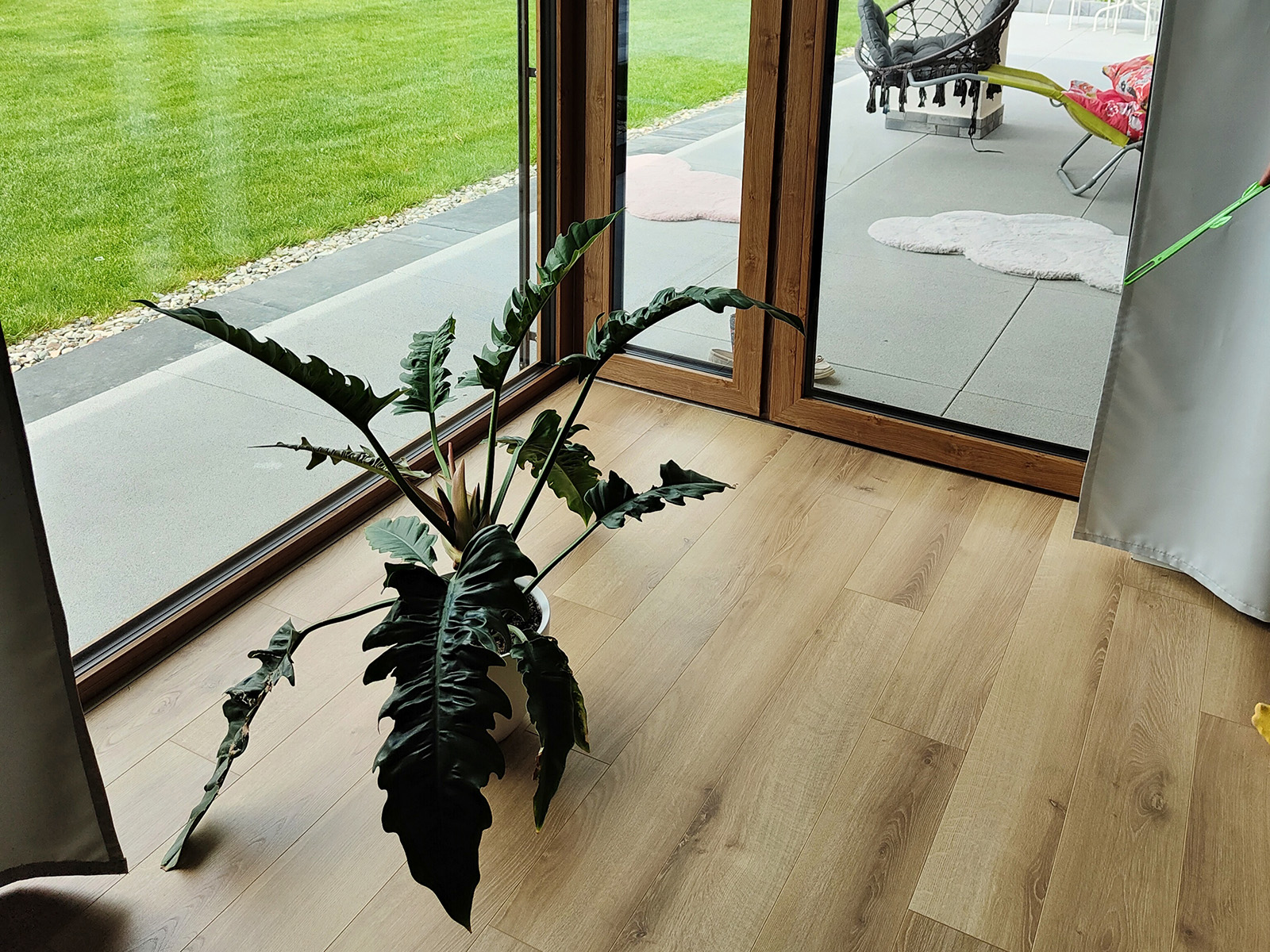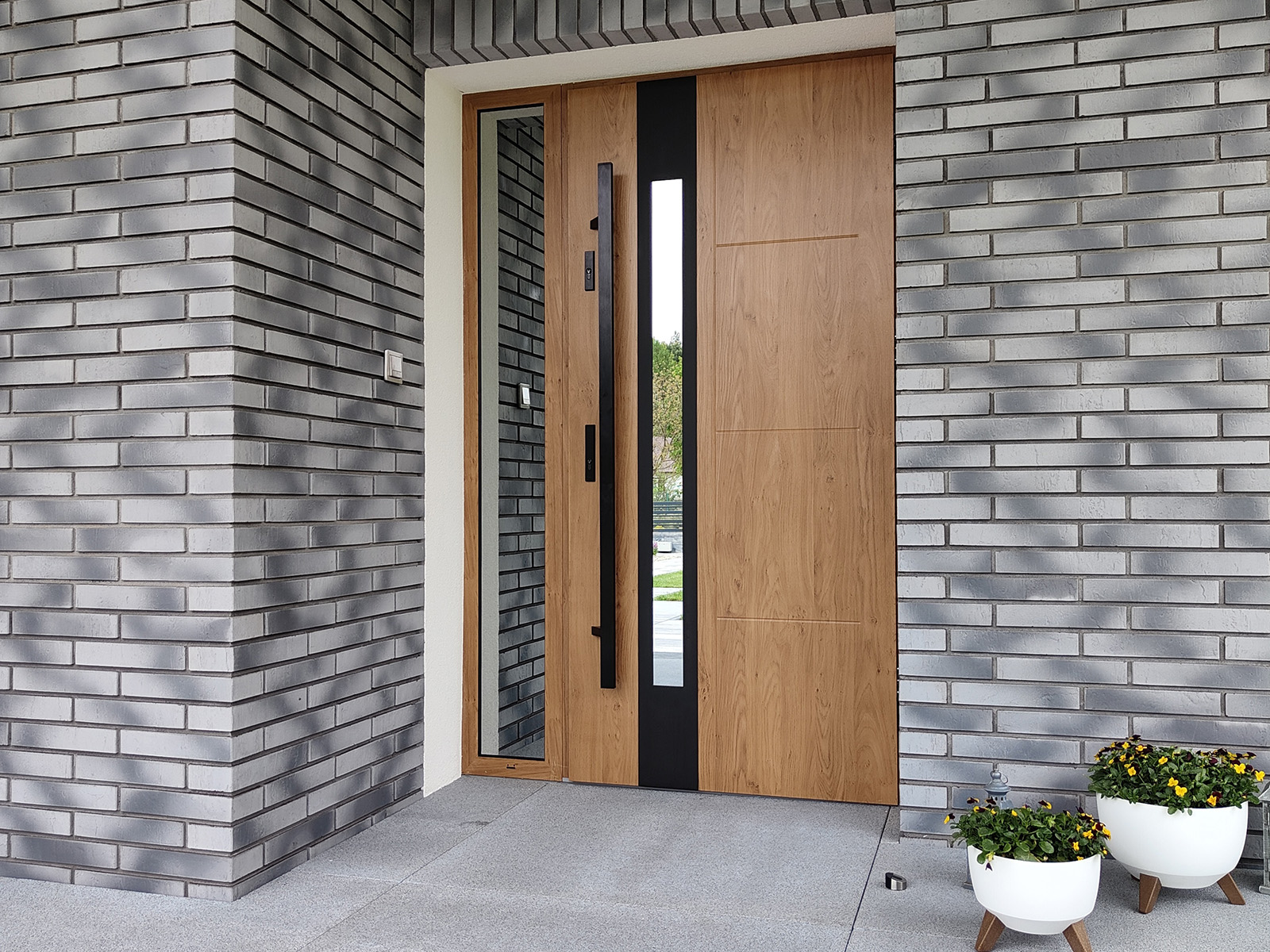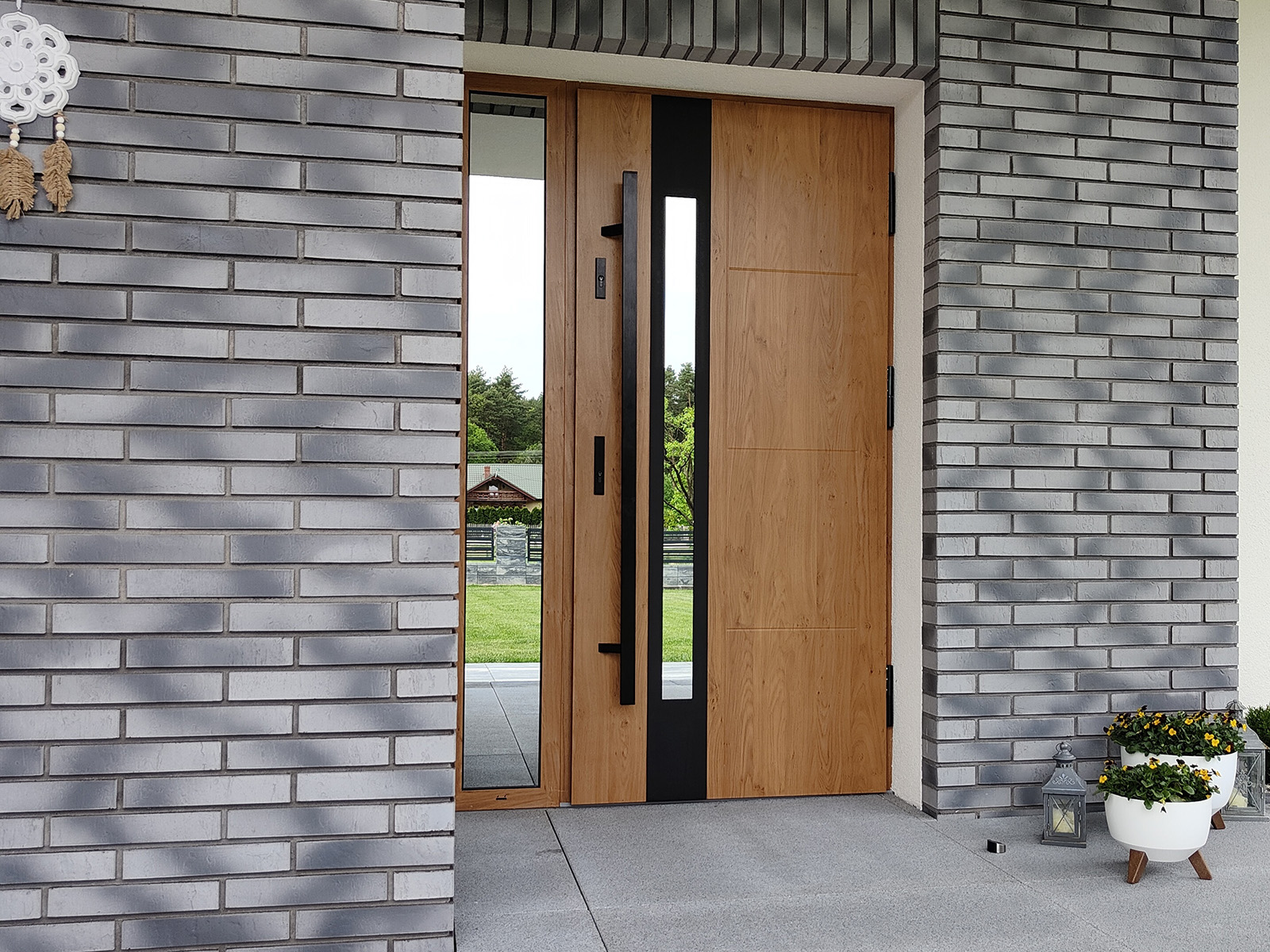 Drzwi w kolorze Winchester wykonano w standardzie pasywnym, zapewniającym wysoką izolacyjność termiczną i szczelność powietrzną. Doświetlenie boczne ze szkłem typu lustro weneckie pozwala na subtelne doświetlenie wnętrza przy zachowaniu prywatności, a solidny, czarny pochwyt gwarantuje wygodny i bezpieczny uchwyt codziennego użytkowania.