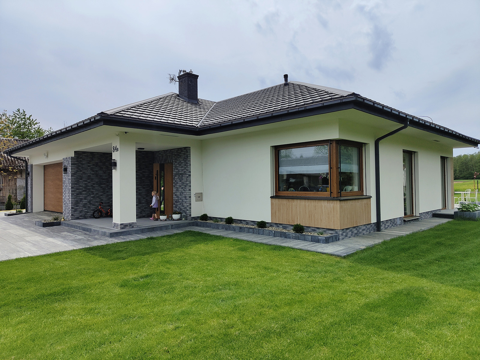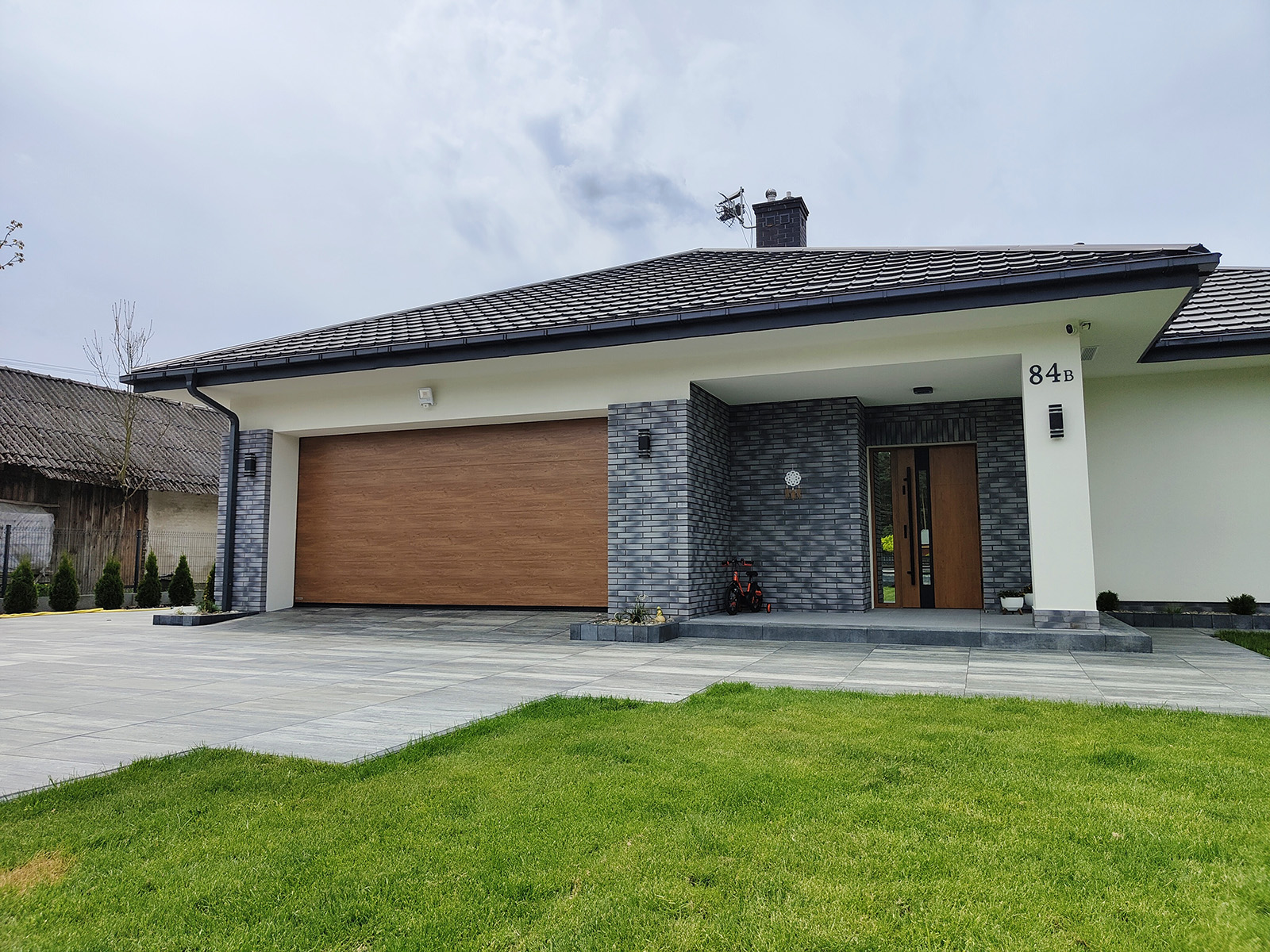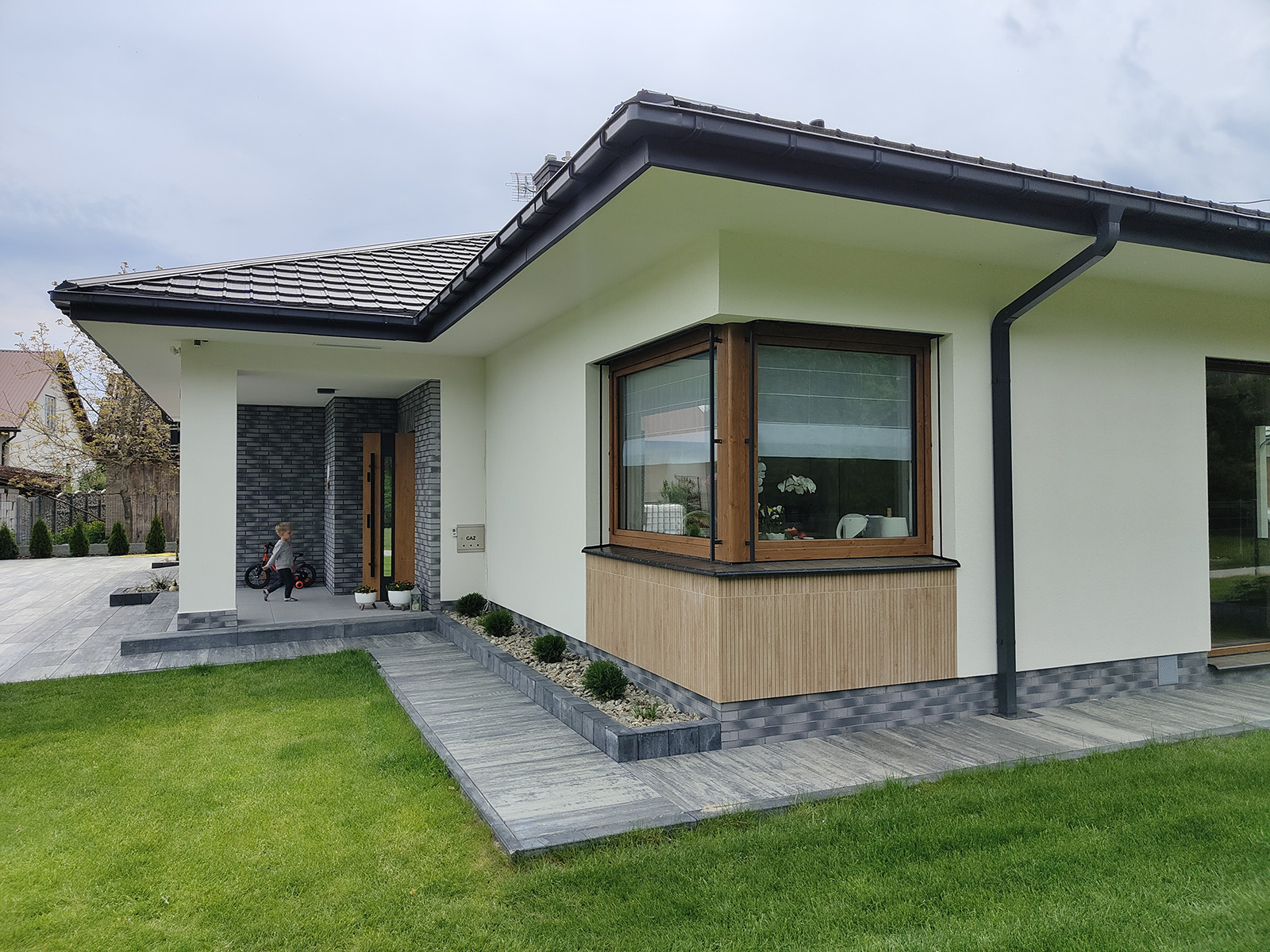 Patrząc na ten dom nasuwają się określenia: rodzinny, przytulny bezpieczny, dom do którego wraca się z przyjemnością. Ciekawe połączenie kolorystyczne grafitowego dachu ze stolarką w kolorze Winchester, całość wspaniale komponuje się z elementami wykończenia elewacji w odcieniach szarości oraz z betonowymi płytami na podjeździe. Absolutnym hitem w tym domu są drzwi wejściowe z dużym doświetleniem bocznym, lustrem weneckim, czarną antabą, ciepłe, w kolorze Winchester. Takie drzwi są wizytówką całego domu, zapraszają do wejścia. Szeroka, podnoszona automatycznie, brama garażowa, zapewnia nie tylko komfort użytkowania garażu, ale również stanowi element dekoracyjny budynku