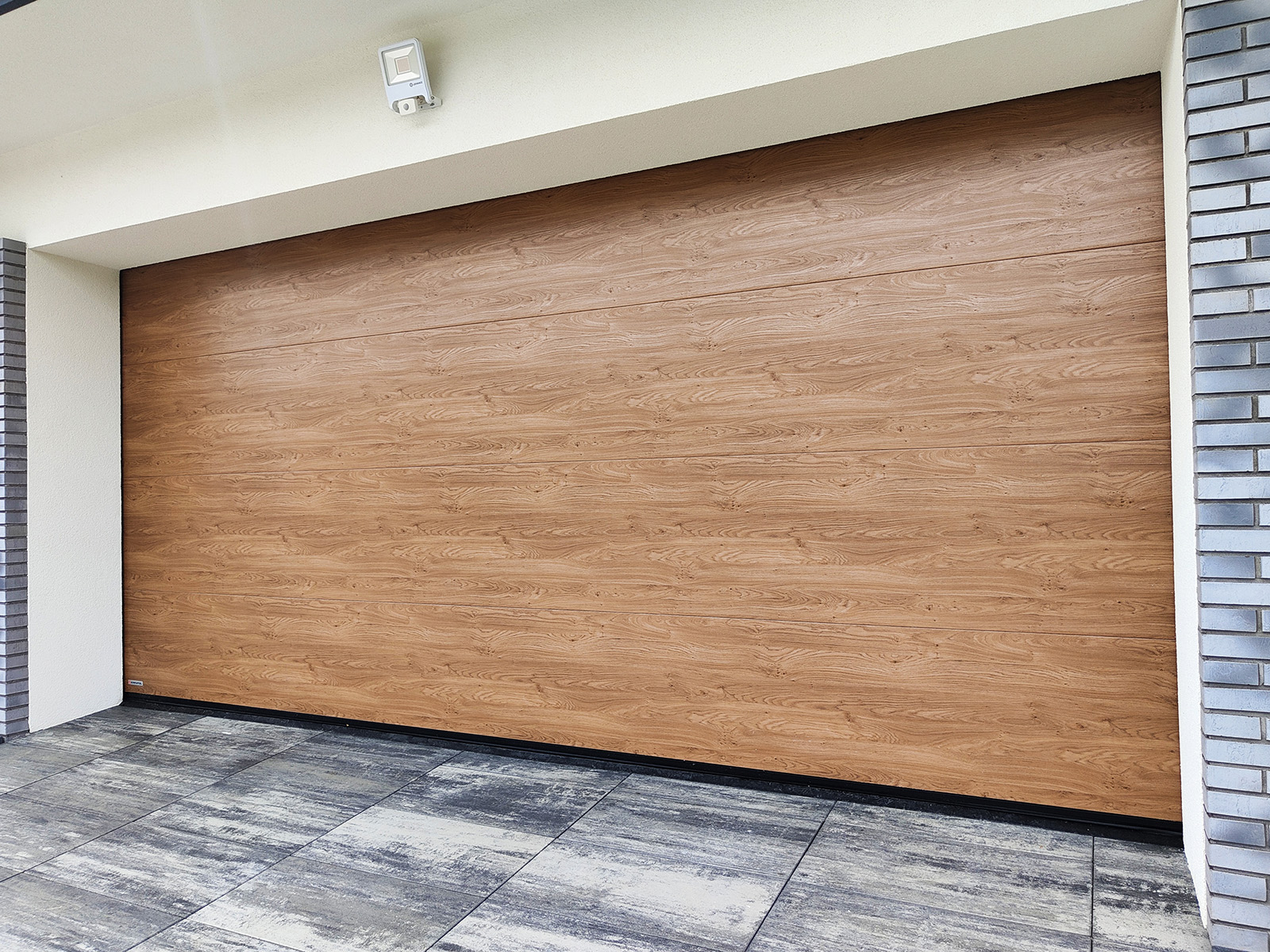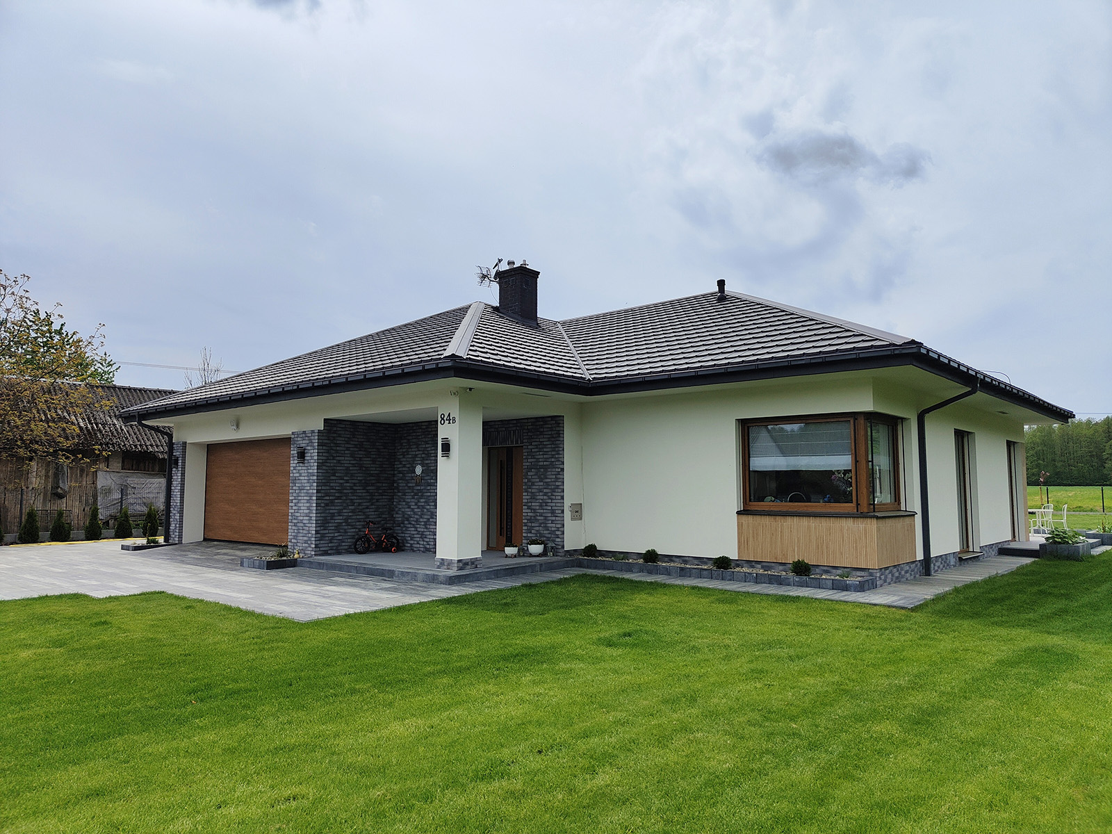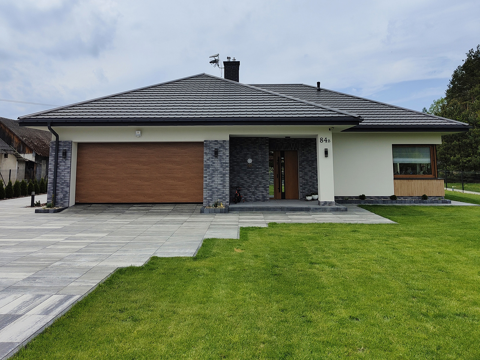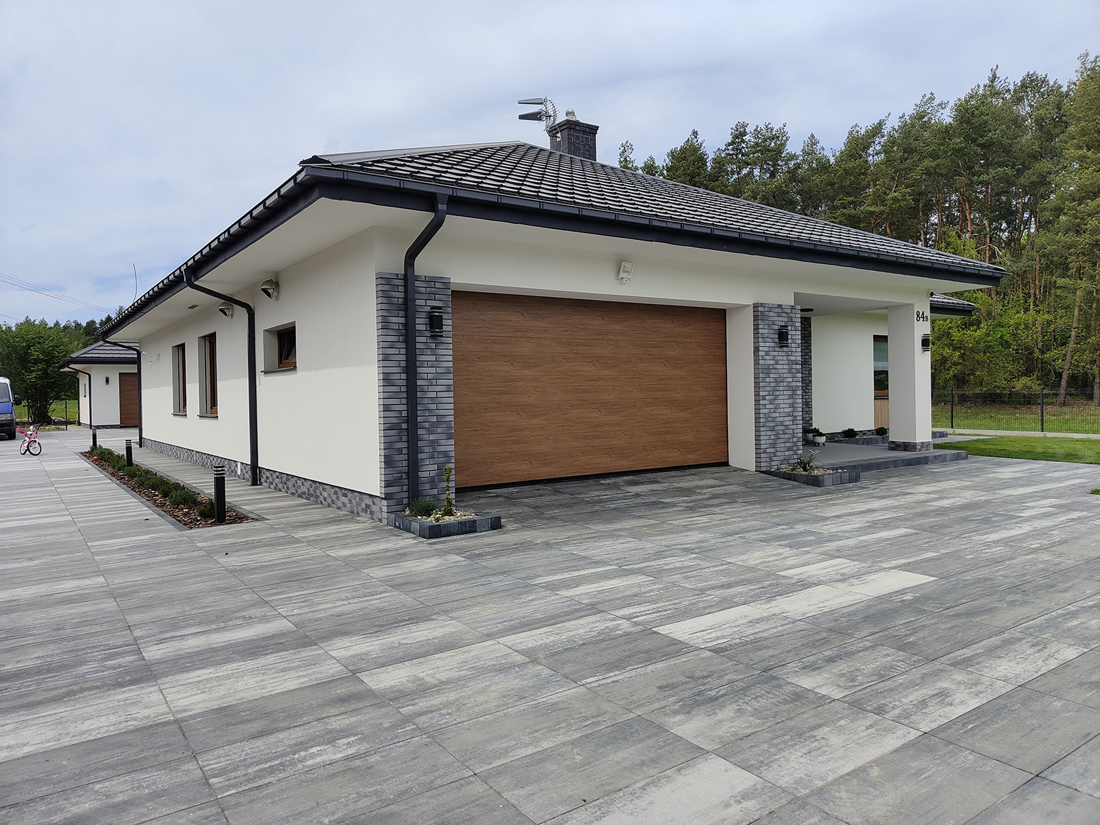 Patrząc na ten dom nasuwają się określenia: rodzinny, przytulny bezpieczny, dom do którego wraca się z przyjemnością. Ciekawe połączenie kolorystyczne grafitowego dachu ze stolarką w kolorze Winchester, całość wspaniale komponuje się z elementami wykończenia elewacji w odcieniach szarości oraz z betonowymi płytami na podjeździe. Absolutnym hitem w tym domu są drzwi wejściowe z dużym doświetleniem bocznym, lustrem weneckim, czarną antabą, ciepłe, w kolorze Winchester. Takie drzwi są wizytówką całego domu, zapraszają do wejścia. Szeroka, podnoszona automatycznie, brama garażowa, zapewnia nie tylko komfort użytkowania garażu, ale również stanowi element dekoracyjny budynku