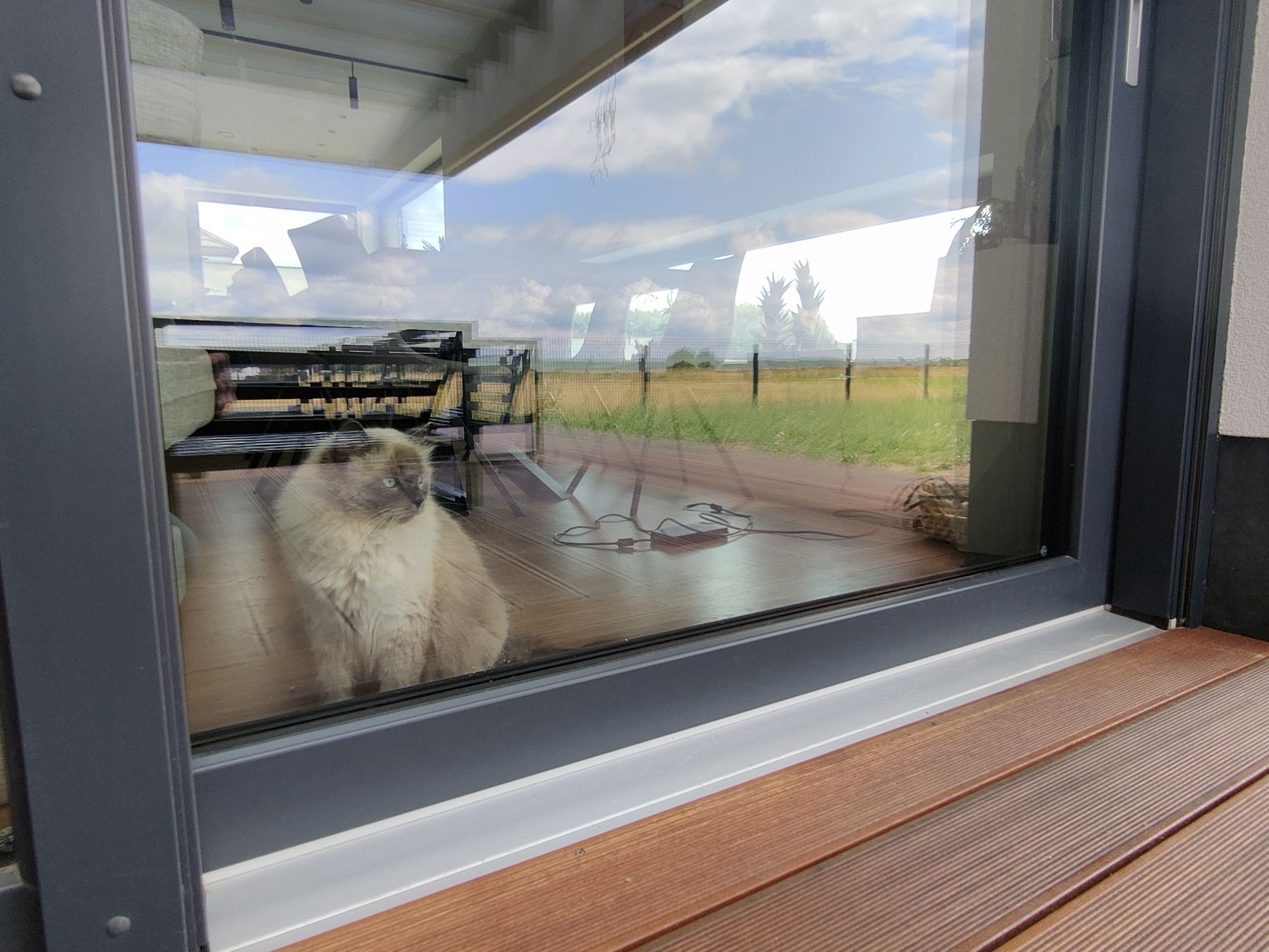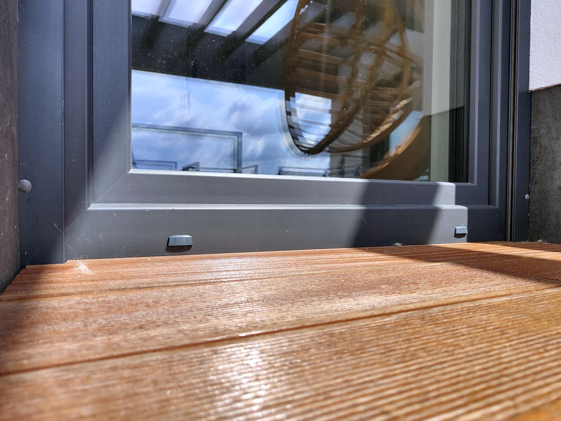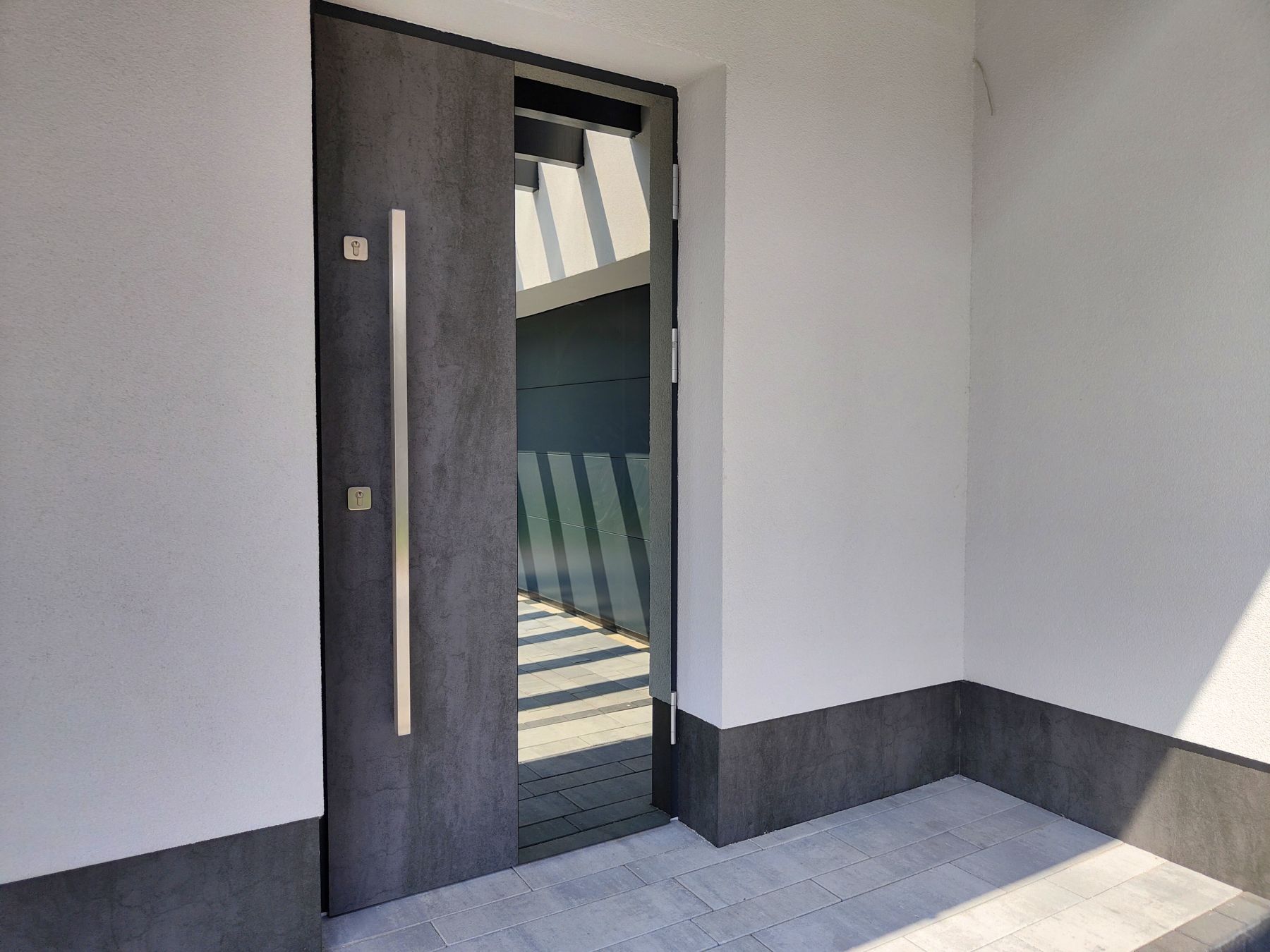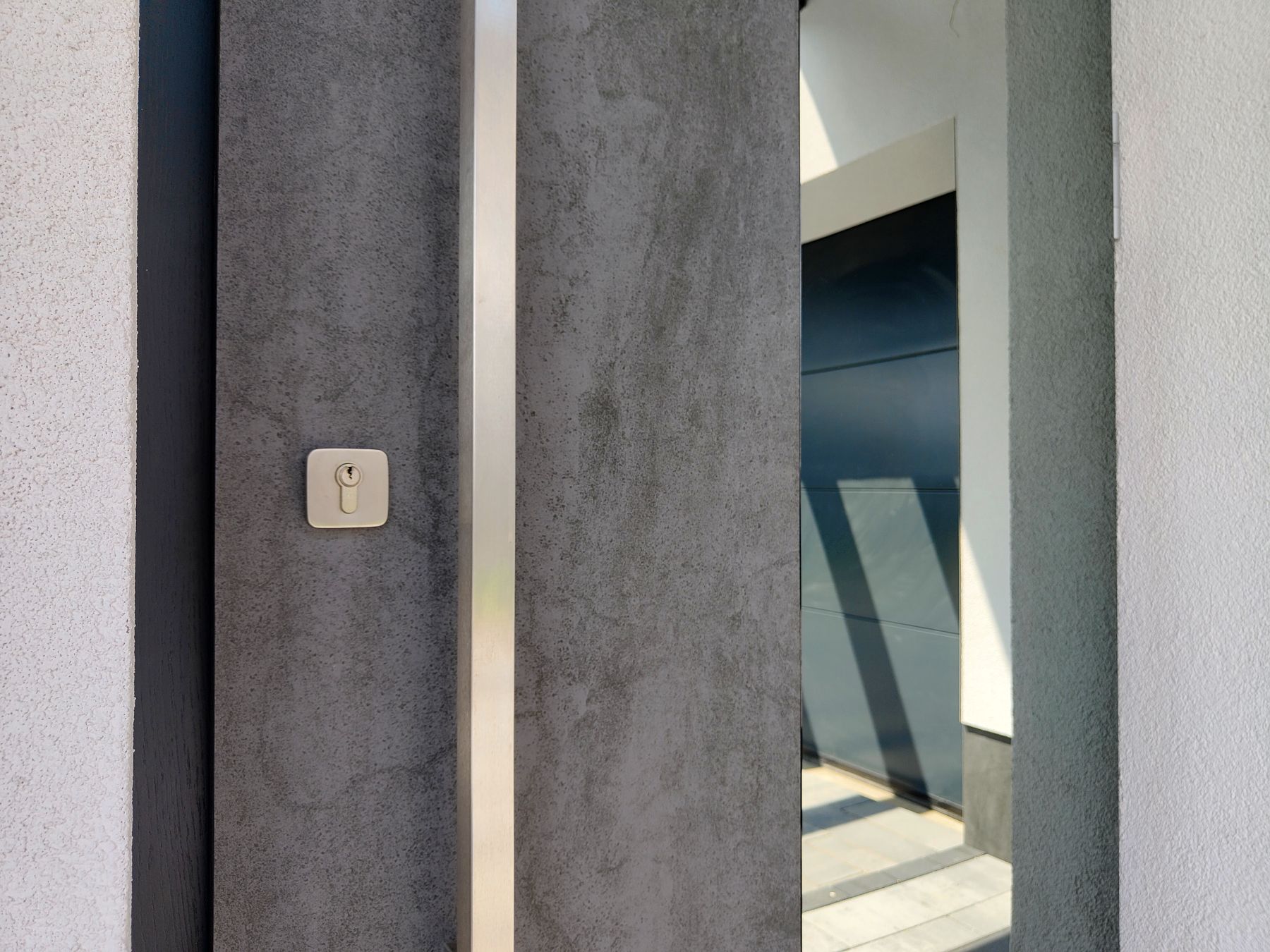 Drzwi zewnętrzne z powierzchnią wykonaną ze spieku kwarcowego i wyposażone w szkło lustro weneckie, podkreśla nowoczesny charakter domu. Rozwiązanie zapewnia elegancję, prywatność oraz wysoką odporność na warunki atmosferyczne.
