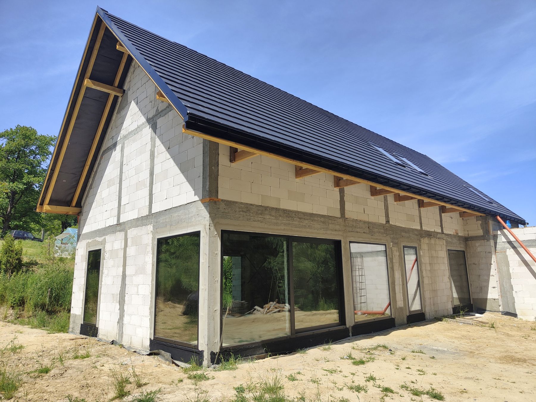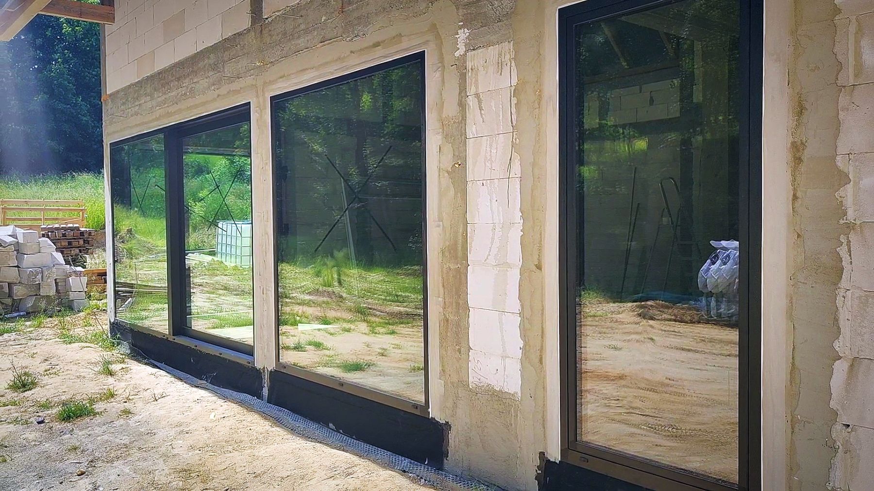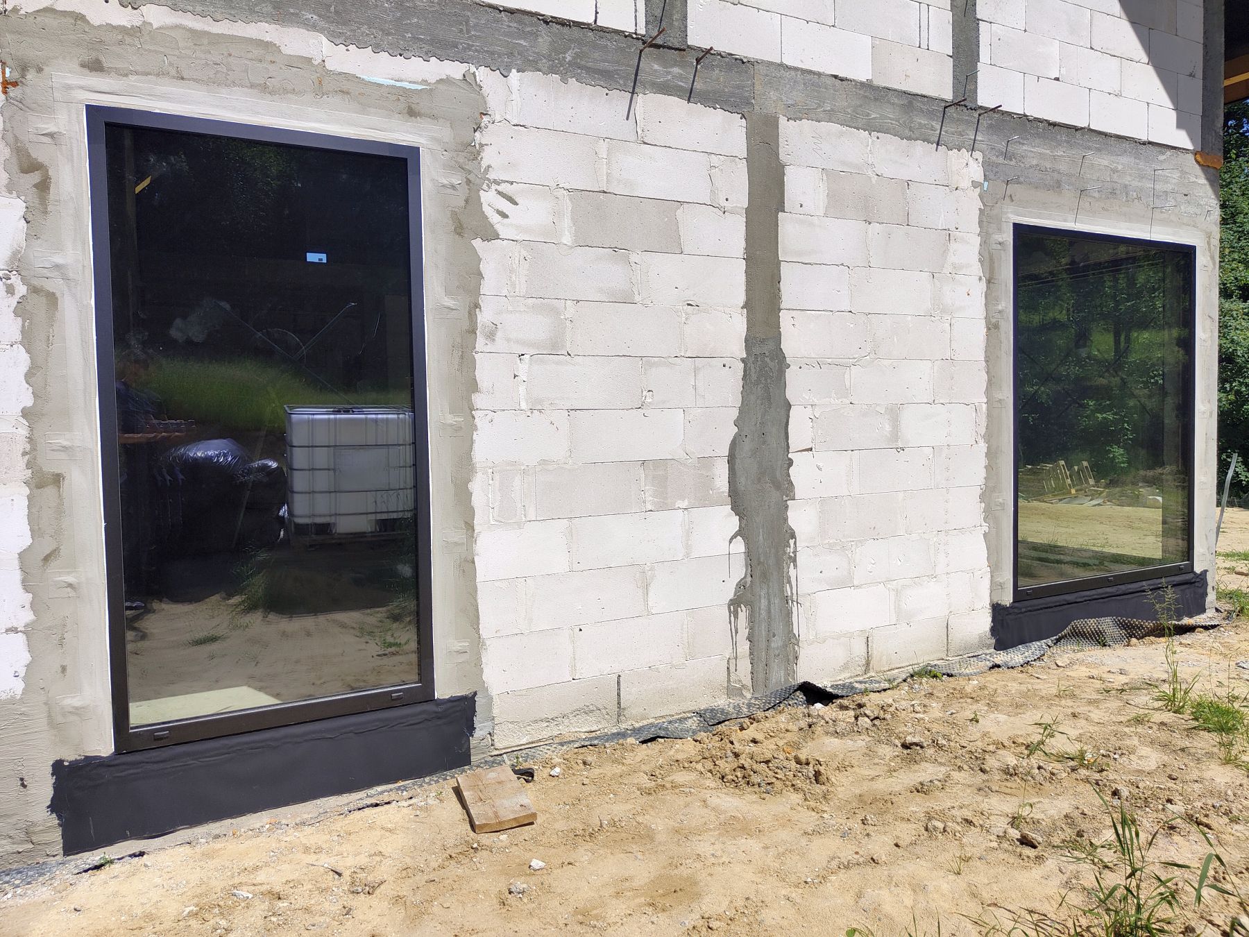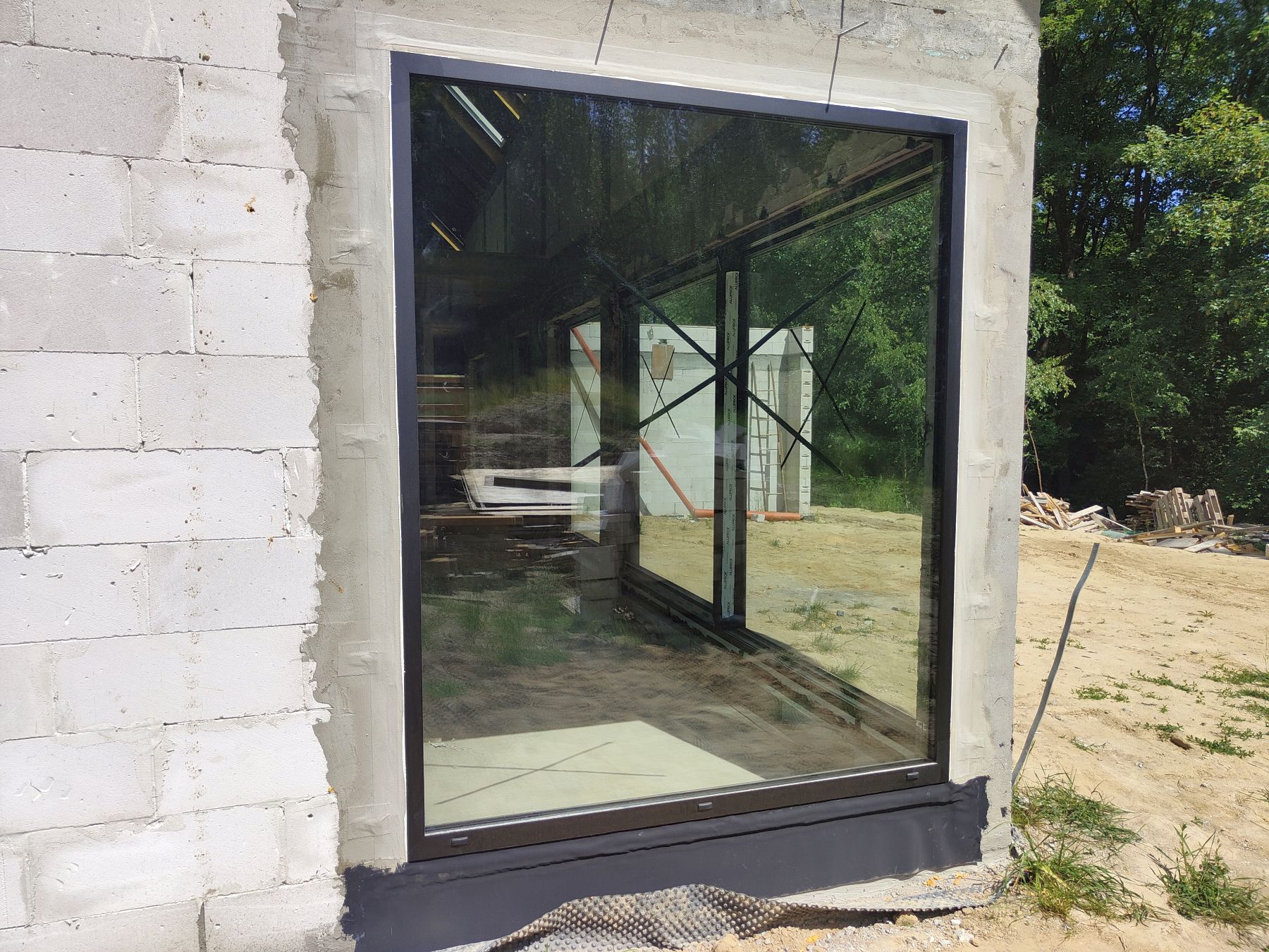 W realizacji zastosowano aluminiowe okna Aluprof MB104 Passive oraz Aluprof MB77HS-HI w wersji otwieranej, stałej i przesuwnej. Stolarka w kolorze czarnym RAL 9005 w strukturze nadała budynkowi elegancki i nowoczesny wygląd. Montaż został wykonany w systemie szczelnego montażu trójwarstwowego z użyciem podwalin klinarytowych, membran wewnętrznych i zewnętrznych oraz hydroizolacji EPDM. Całość dopełnia dokładne doszczelnienie chemią uszczelniającą, co gwarantuje trwałość i energooszczędność konstrukcji.