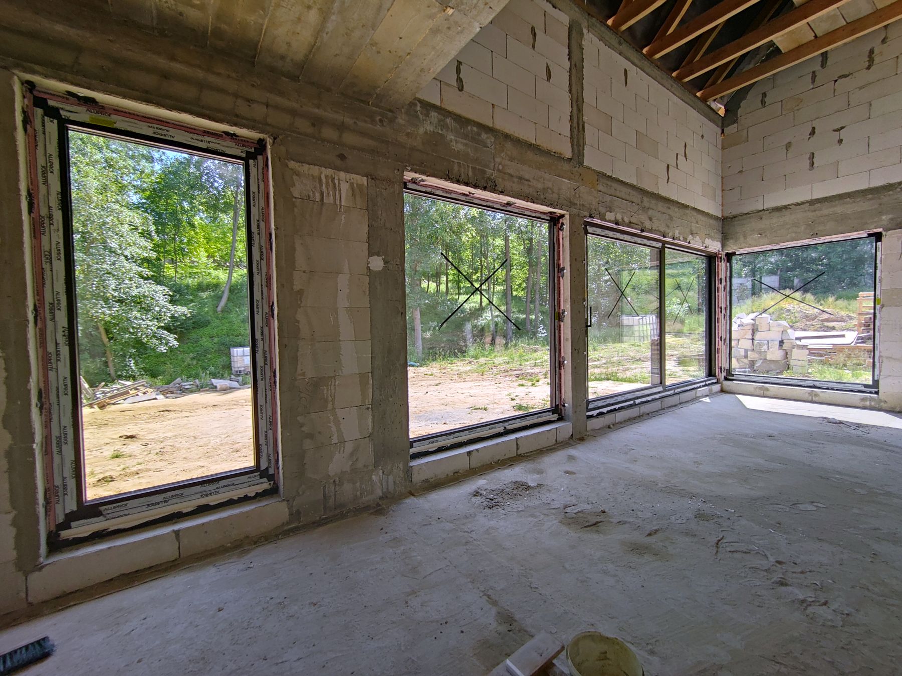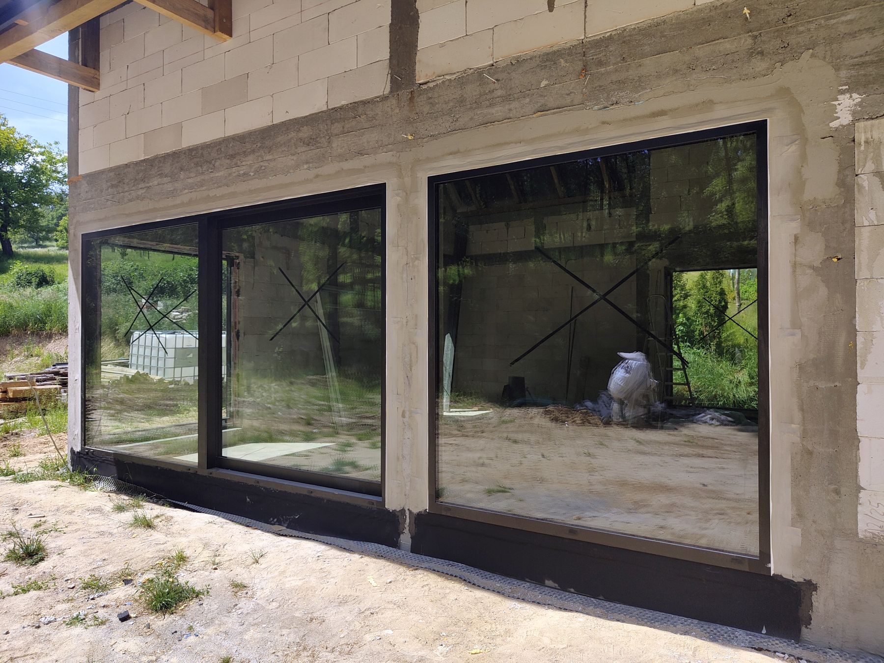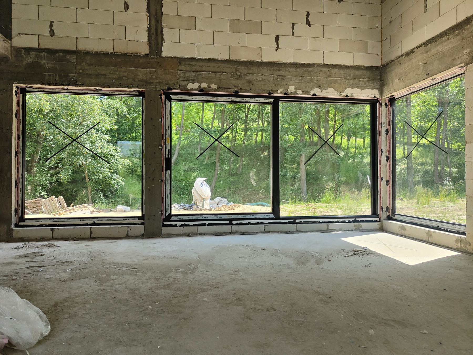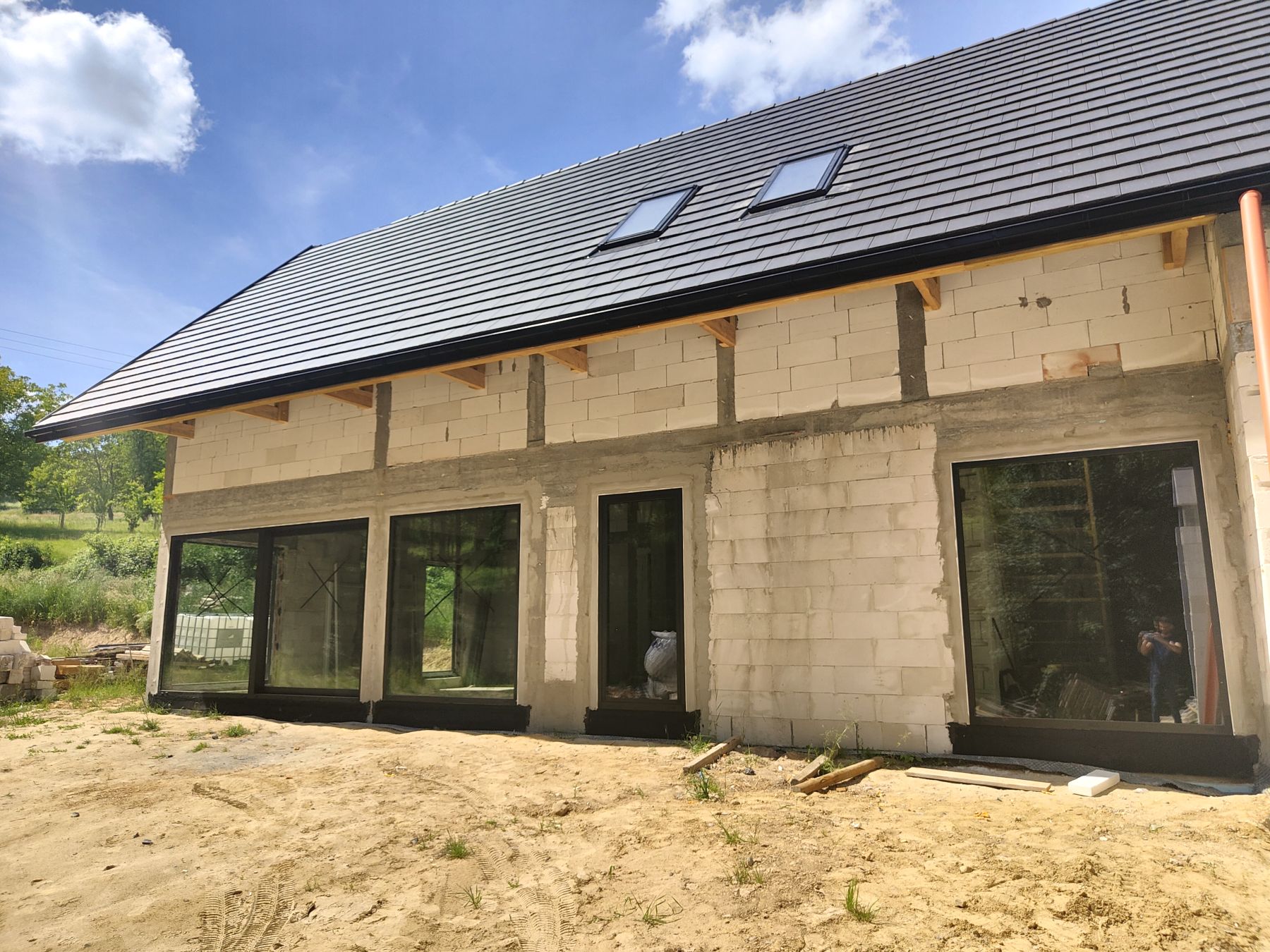 W realizacji zastosowano aluminiowe okna Aluprof MB104 Passive oraz Aluprof MB77HS-HI w wersji otwieranej, stałej i przesuwnej. Stolarka w kolorze czarnym RAL 9005 w strukturze nadała budynkowi elegancki i nowoczesny wygląd. Montaż został wykonany w systemie szczelnego montażu trójwarstwowego z użyciem podwalin klinarytowych, membran wewnętrznych i zewnętrznych oraz hydroizolacji EPDM. Całość dopełnia dokładne doszczelnienie chemią uszczelniającą, co gwarantuje trwałość i energooszczędność konstrukcji.