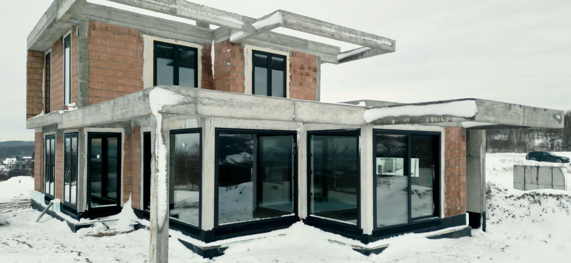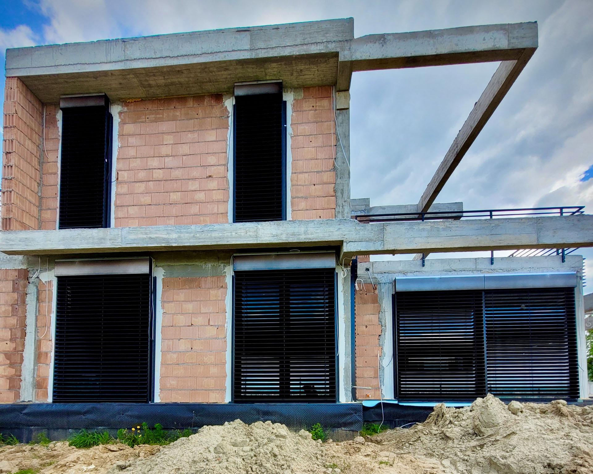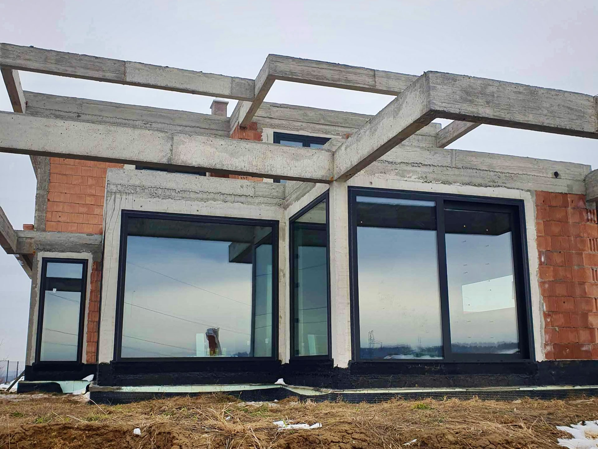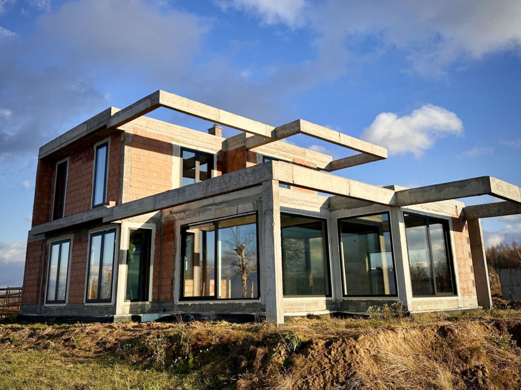 Projekt domu o nietypowej bryle został wyposażony w stolarkę aluminiową marki Aluprof – okna MB86N SI oraz drzwi przesuwne MB77HS Monorail HI. Wszystkie profile wykonano w kolorze RAL 9005 czarny strukturalny, co nadaje nowoczesny i elegancki charakter elewacji. Montaż przeprowadzono na podwalinach purenitowych, gwarantujących stabilność i izolacyjność termiczną. Zastosowano system montażu 3-warstwowego – szczelny, z pełną hydroizolacją przy użyciu fartuchów EPDM, co zapewnia trwałość i pełną ochronę przed wilgocią.