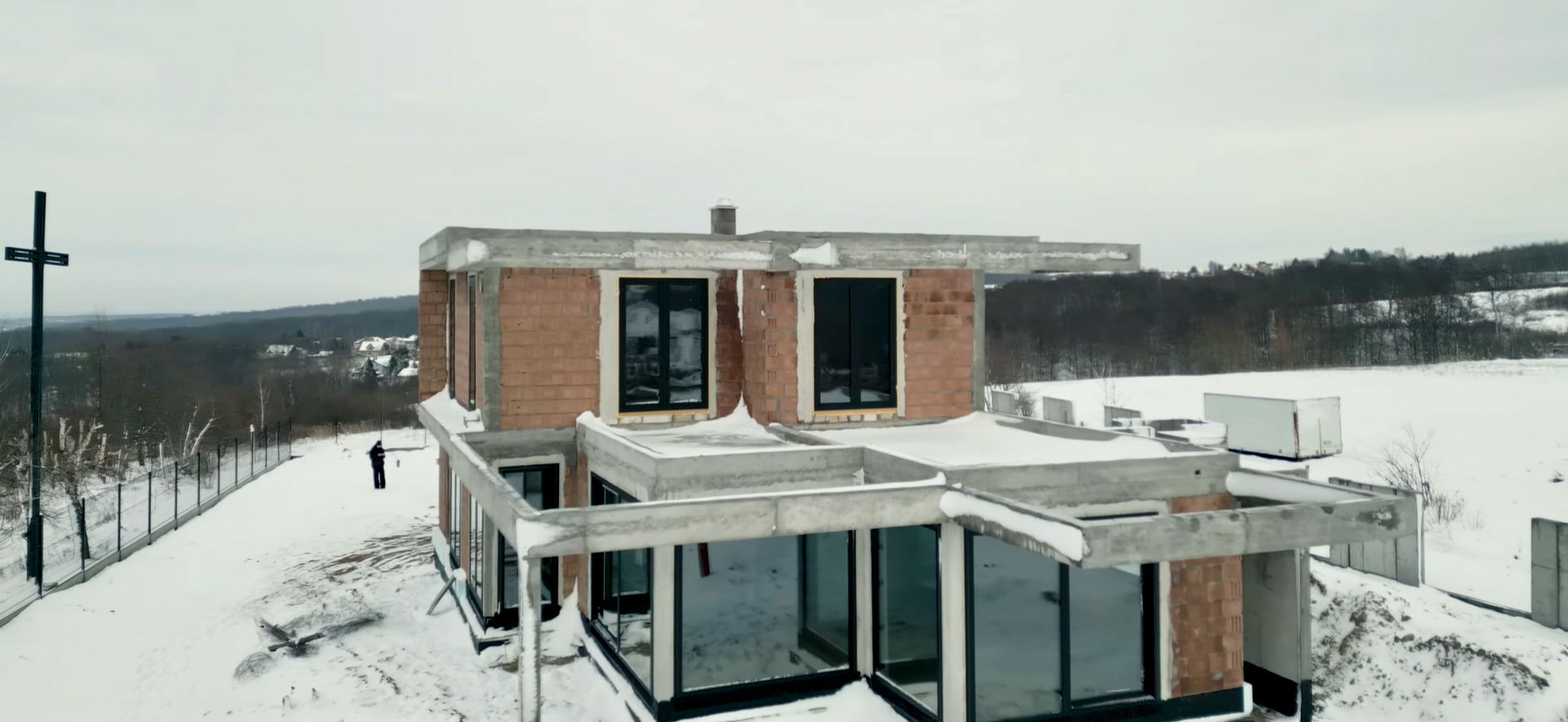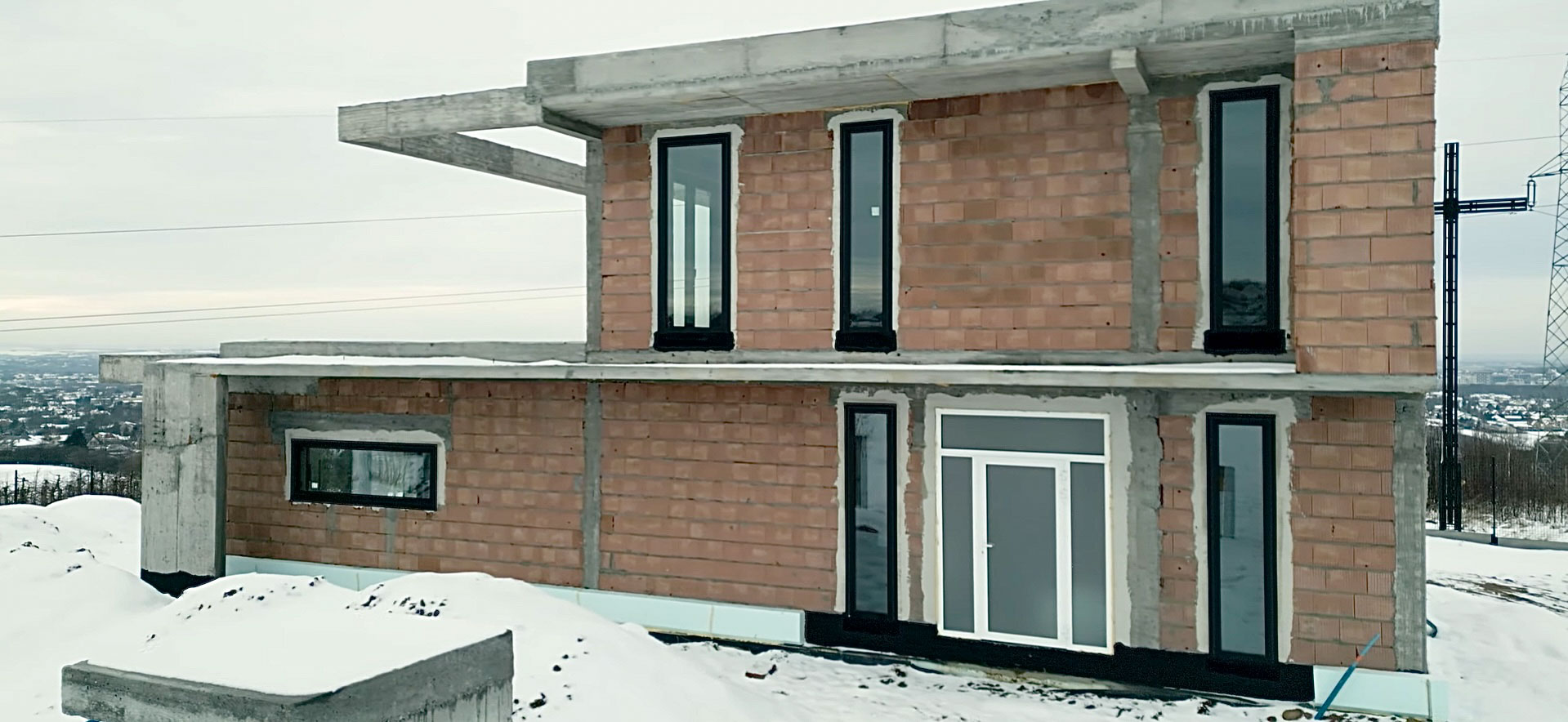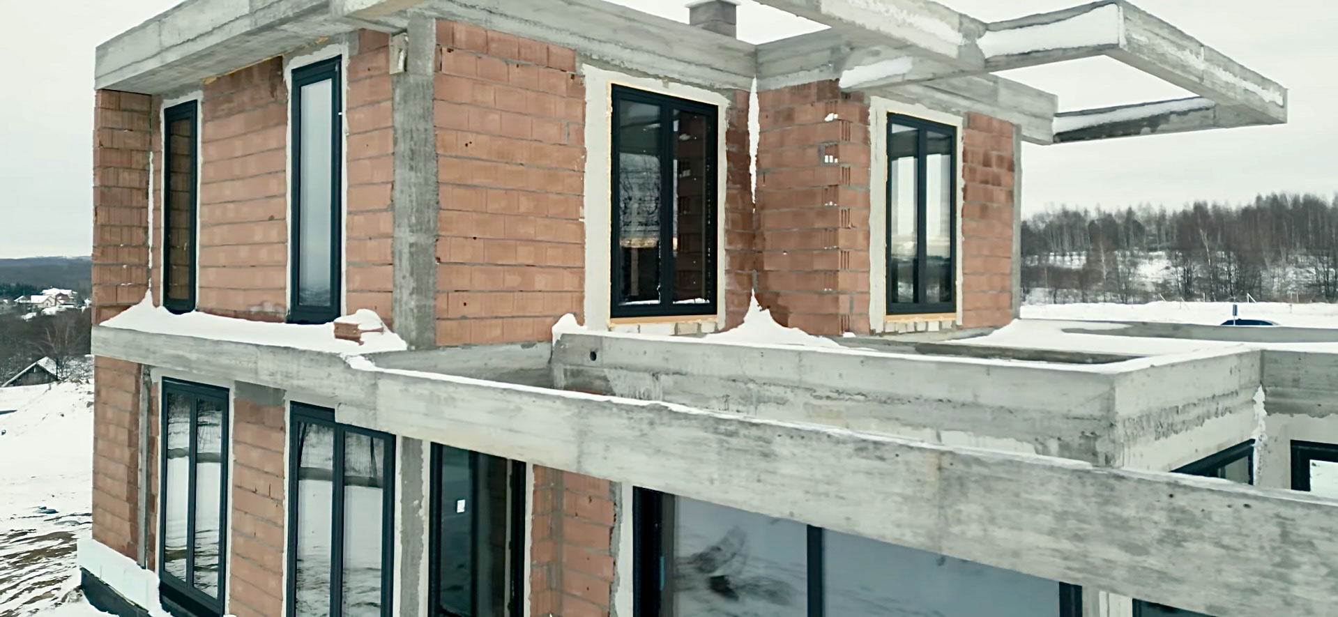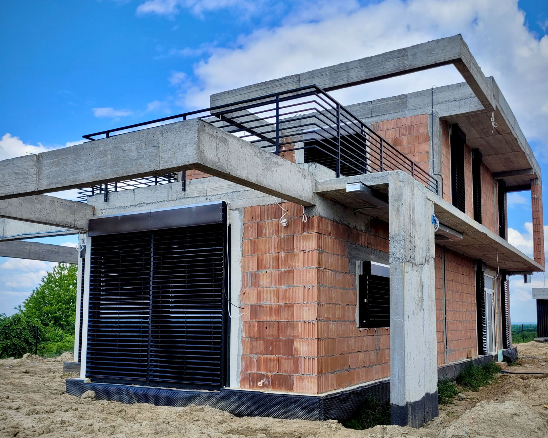 Projekt domu o nietypowej bryle został wyposażony w stolarkę aluminiową marki Aluprof – okna MB86N SI oraz drzwi przesuwne MB77HS Monorail HI. Wszystkie profile wykonano w kolorze RAL 9005 czarny strukturalny, co nadaje nowoczesny i elegancki charakter elewacji. Montaż przeprowadzono na podwalinach purenitowych, gwarantujących stabilność i izolacyjność termiczną. Zastosowano system montażu 3-warstwowego – szczelny, z pełną hydroizolacją przy użyciu fartuchów EPDM, co zapewnia trwałość i pełną ochronę przed wilgocią.
